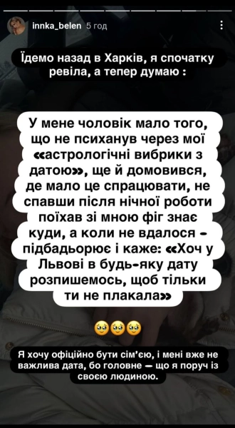 Як констатувала блогерка, пара збиралась офіційно стати чоловіком та дружиною у дзеркальну дату 20.02.2026, яку вони з коханим вважають особливо знаковою, проте реєстрацію шлюбу не вдалося здійснити.