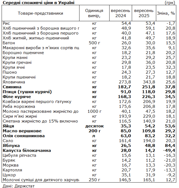 Яблука додали у вартості з 26,5 до 48,8 гривень за кілограм, що показує збільшення на 84,4%. Відчутно здорожчало м’ясо: свинина піднялась з 182,7 до 251,8 гривень за кілограм (+37,8%), куряче філе – з 168,3 до 226,3 гривень (+34,5%), а курячі тушки – з 91 до 118 гривень (+29,8%).