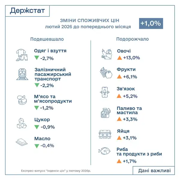 На тлі загального збільшення цін в лютому традиційно знизилась вартість одягу та взуття (на 2,7%), що зумовлено закінченням зимового сезону і акціями розпродажу. Алкогольні напої та тютюнові вироби стали дорожчими на 1,2% (тютюнові вироби – на 1,6%).