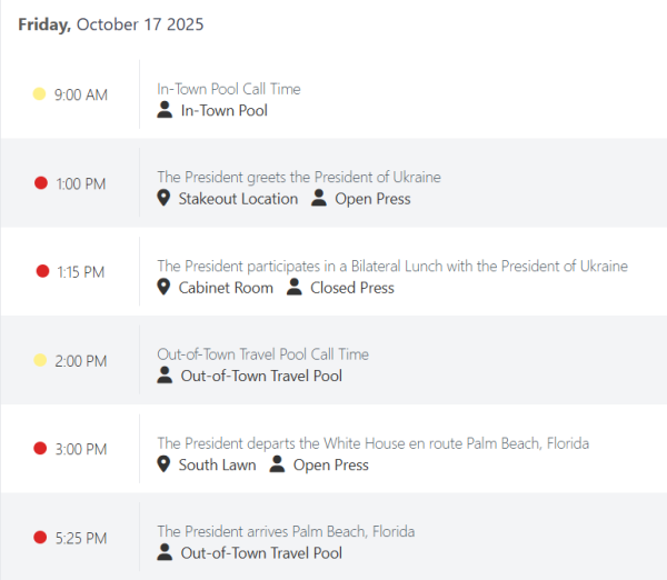 Також вказано, що після завершення даної зустрічі, о 22:00, Дональд Трамп відправиться до Флориди.