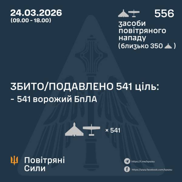 Зокрема, з 09.00 по 18.00 24 березня, за попередніми даними, ворог застосував 556 ударних БПЛА, з яких силами протиповітряної оборони збито/приглушено 541 БПЛА.