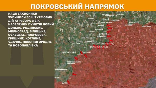 На Покровському напрямку наші захисники зупинили 30 штурмових дій агресора в напрямку населених пунктів Новий Донбас, Родинське, Мирноград, Білицьке, Сухецьке, Покровськ, Гришине, Котлине, Удачне, Новопідгородне та Новопавлівка.