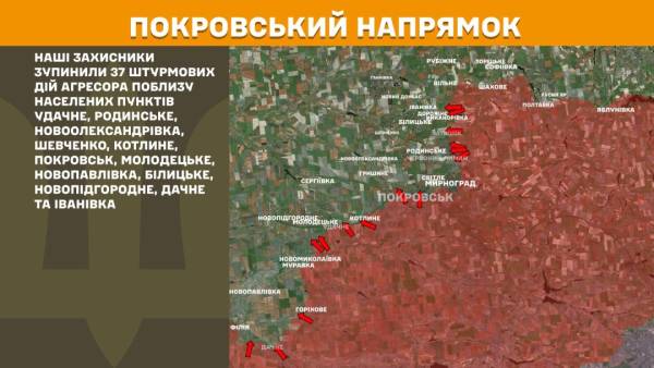 На Покровському напрямку наші захисники зупинили 37 штурмових дій агресора поблизу населених пунктів Удачне, Родинське, Новоолександрівка, Шевченко, Котлине, Покровськ, Молодецьке, Новопавлівка, Білицьке, Новопідгородне, Дачне та Іванівка.