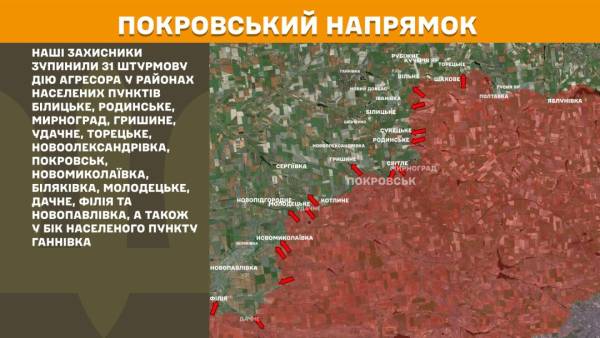 На Покровському напрямку захисники України зупинили 31 штурмову дію російської армії в районах Білицького, Родинського, Мирнограда, Гришиного, Удачного, Торецького, Покровська, Новоолександрівки, Новомиколаївки, Біляківки, Молодецького, Дачного, Філії та Новопавлівки, а також у напрямку Ганнівки.