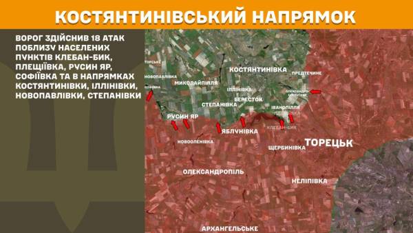 На Костянтинівському напрямку російські війська здійснили 18 атак поблизу Клебан-Бика, Плещіївки, Русиного Яру, Софіївки та в напрямках Костянтинівки, Іллінівки, Новопавлівки і Степанівки.
