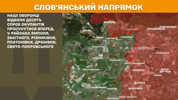 На Слов’янському напрямку Сили оборони відбили 10 спроб окупантів просунутися в районах Ямполя, Закітного, Різниківки, Платонівки, Дронівки і Свято-Покровського.
