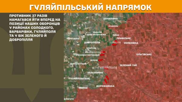 На Гуляйпільському напрямку ворог 37 разів намагався просуватися вперед в районах Солодкого, Варварівки, Гуляйполя та у напрямку Зеленого й Добропілля.