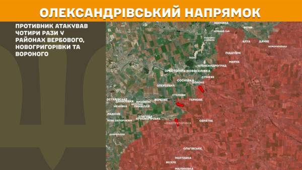 На Олександрівському напрямку ворог атакував чотири рази в околицях Вербового, Новогригорівки та Вороного.
