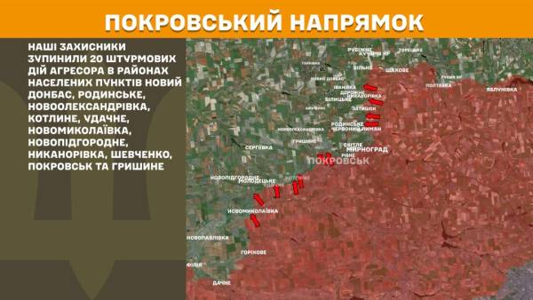 На Покровському напрямку українські оборонці зупинили 20 штурмових дій агресора в околицях Нового Донбасу, Родинського, Новоолександрівки, Котлиного, Удачного, Новомиколаївки, Новопідгороднього, Никанорівки, Шевченка, Покровська та Гришиного.