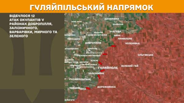 На Гуляйпільському напрямку відбулося 12 атак окупантів в околицях Добропілля, Залізничного, Варварівки, Мирного та Зеленого.