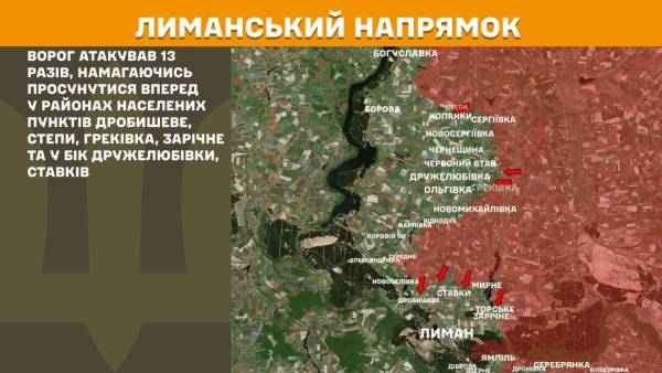 На Лиманському напрямку противник атакував 13 разів, намагаючись просунутися в районах Дробишевого, Степів, Греківки, Зарічного та в напрямку Дружелюбівки, Ставків.