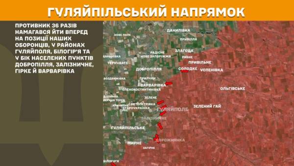 На Гуляйпільському напрямку російські війська 36 разів намагались прорватися вперед у районах Гуляйполя, Білогір’я та в напрямку Добропілля, Залізничного, Гіркого і Варварівки.