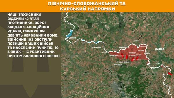 На Північно-Слобожанському і Курському напрямках українські військові відбили 12 ворожих наступів. Окупанти здійснили три авіанальоти, скинувши дев’ять керованих авіабомб, та провели 103 обстріли, з яких 10 – з РСЗВ.